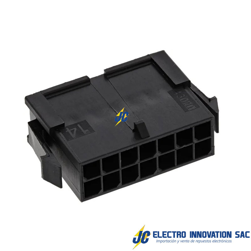 ➨MARCA: MOLEX ➨CÓDIGO: 43020-1400 ➨CLASE DE CONECTOR: MACHO AEREO ➨NÚMERO DE PINES: 14 (7X2) ➨TAMAÑO DE CONTACTOS: 3MM ➨CORRIENTE MÁXIMA: 5A ➨TEMPERATURA: -40…105°C ➨SERIE DE CONECTOR: MICRO FIT 3.0